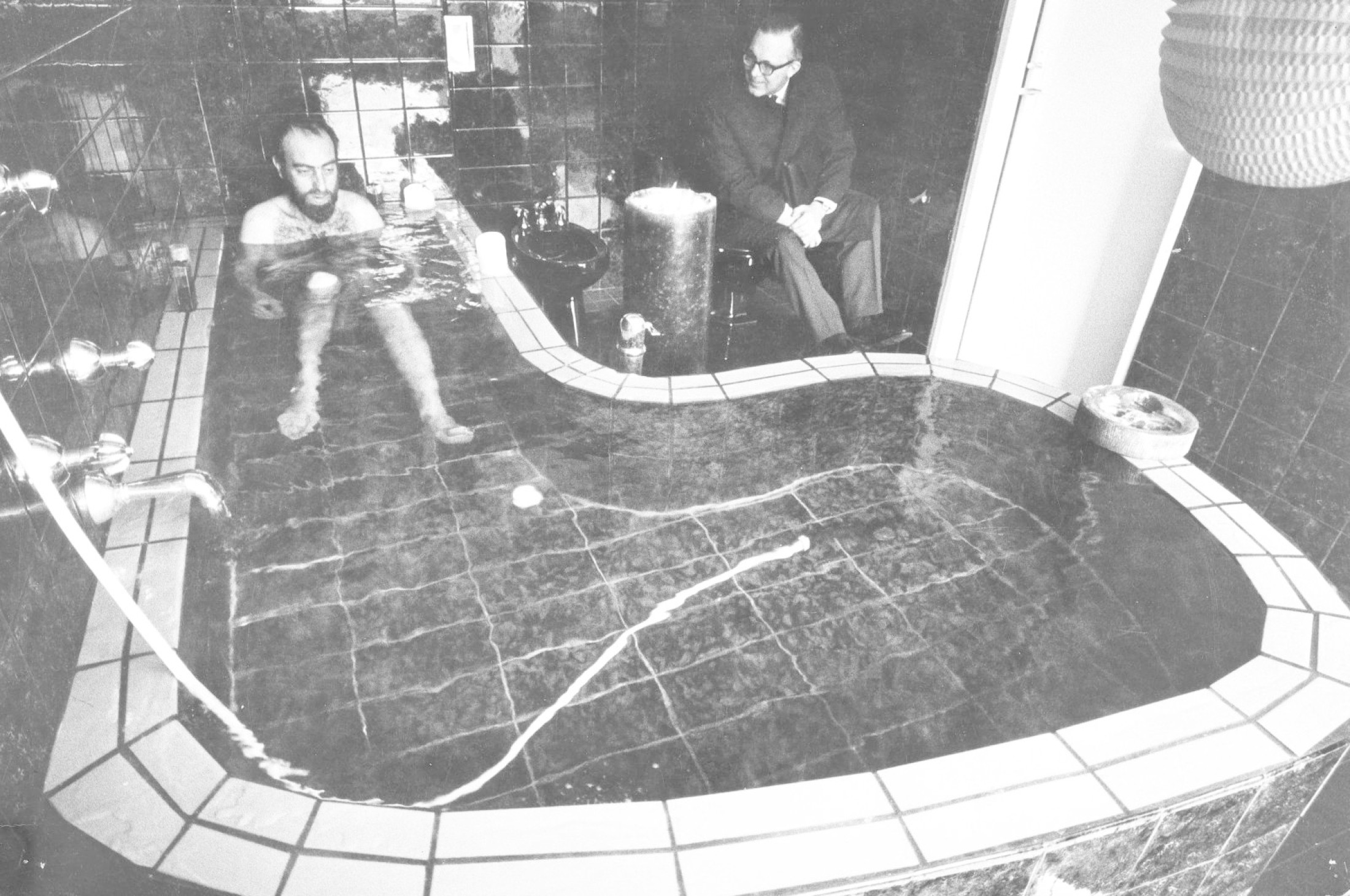 Hundertwasser empfängt seinen Anwalt Fritz Bernhard in der Wohnung in der Spiegelgasse, im O-Furo, einerjapanischen Badewanne.