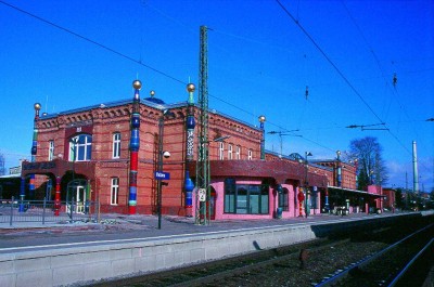Hundertwasser hat den Bahnhof aus wilhelminischer Zeit, der durch spätere Umbauten verunstaltet wurde, umgestaltet. Besonders wichtig war ihm die Pflanzung von Bäumen, wo immer es möglich erschien.
